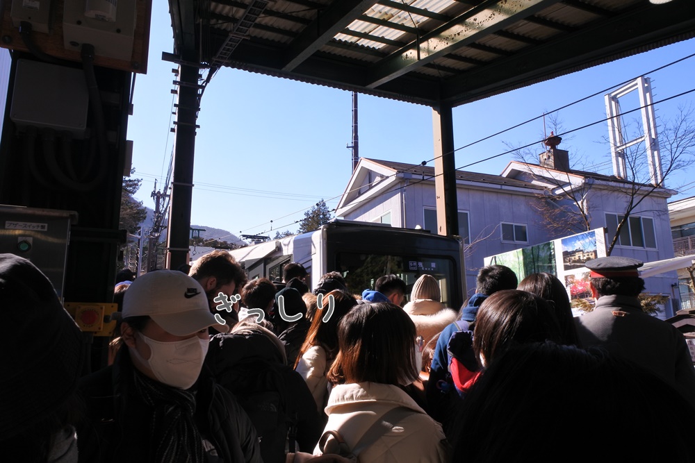 強羅駅でケーブルカーに乗りかえ。ホームはひとが溢れてて、これ乗るのムリじゃね?と思ったんですが